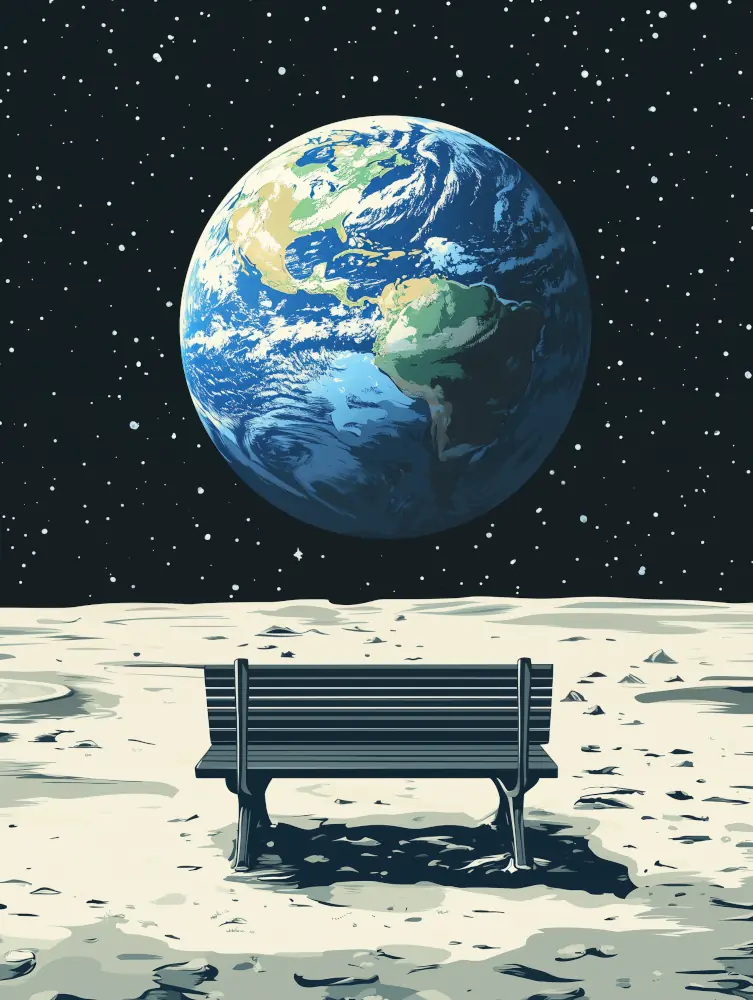 « Contemplation Lunaire » est une œuvre qui invite à la réflexion et à l’émerveillement, en juxtaposant l’intimité d’un banc solitaire avec la majesté de la Terre vue depuis la Lune.