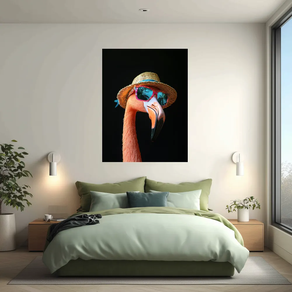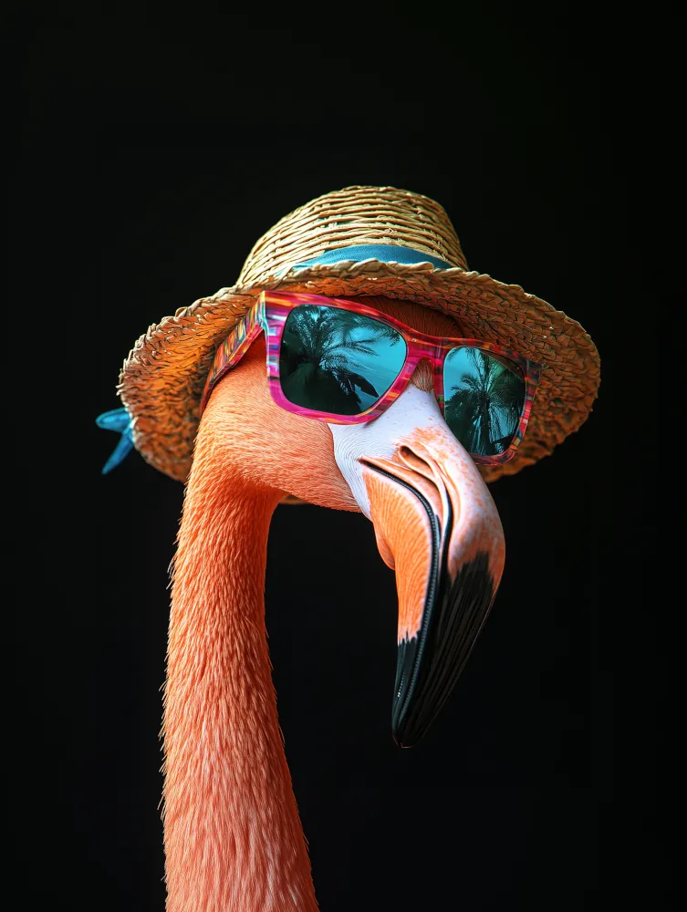 « Le Flamant en Vacances » est une œuvre qui capture l’essence de la joie et de l’insouciance. Ce portrait d’un flamant rose, habillé d’un chapeau de paille et de lunettes de soleil colorées, évoque un sentiment de liberté et de plaisir estival.