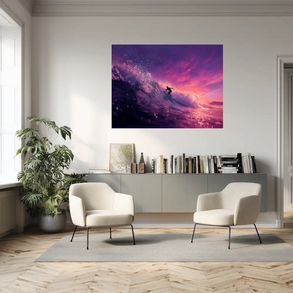 “Glisse finale” nous transporte au cœur d’un moment où le temps semble s’étirer, juste avant que la lumière du jour ne s’éteigne. On y découvre un surfeur qui glisse sur une vague vibrante, éclairée par les derniers rayons d’un ciel en feu.