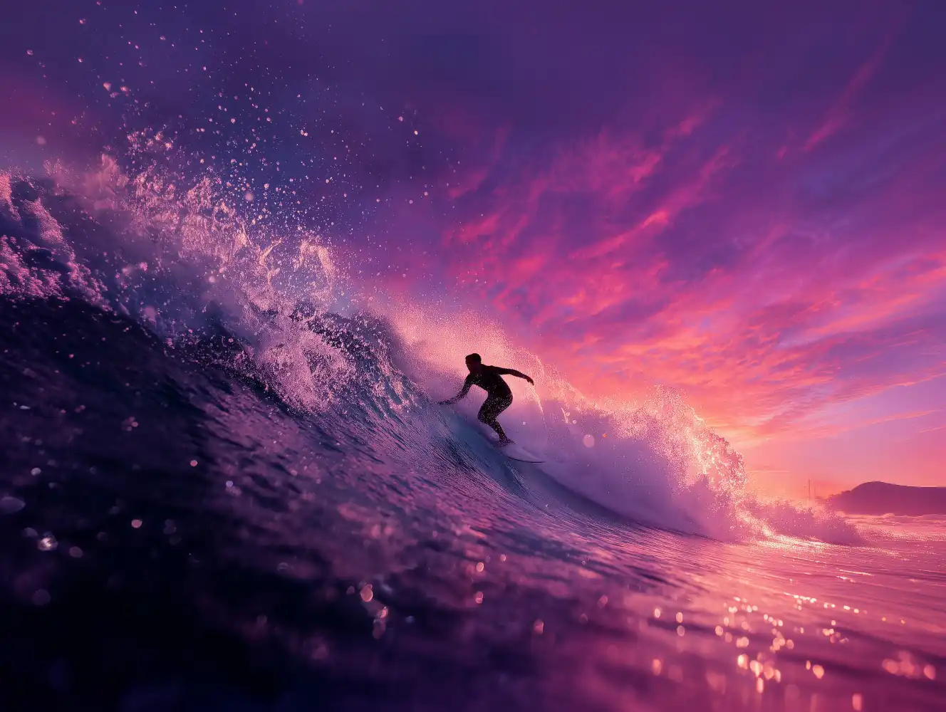 Les teintes violettes, roses et orangées s’entremêlent pour créer une atmosphère presque irréelle, comme si la mer elle-même reflétait un rêve en mouvement.