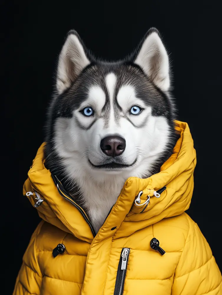Portrait vibrant d’un husky au regard profond, sublimé par une veste jaune éclatante. L’œuvre mêle humour, élégance et poésie, révélant la beauté et la force tranquille de cet animal iconique.