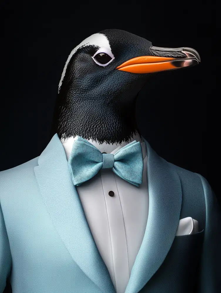 Bienvenue devant cette œuvre intitulée « Le pingouin sur son 31 ». Ce portrait nous propose une rencontre inhabituelle entre le monde sauvage et les codes de l’élégance humaine.