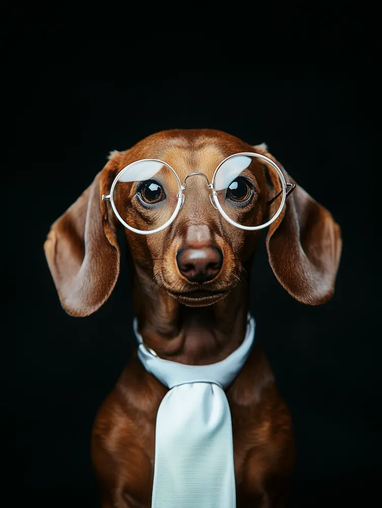 Vêtu de lunettes rondes et d’une cravate blanche, il dégage une allure à la fois sérieuse et attachante. Son expression pensive semble refléter une forme de sagesse et d’intelligence, comme s’il observait le monde avec réflexion.