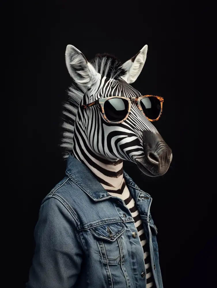 Le zèbre, animal sauvage par excellence, se pare ici des attributs de l’urbanisme moderne. Ses rayures, signature de la nature, dialoguent avec une veste en jean, symbole d’une culture urbaine universelle. Les lunettes de soleil ajoutent une touche d’anonymat, presque humaine, comme un clin d’œil à notre propre quête d’identité.