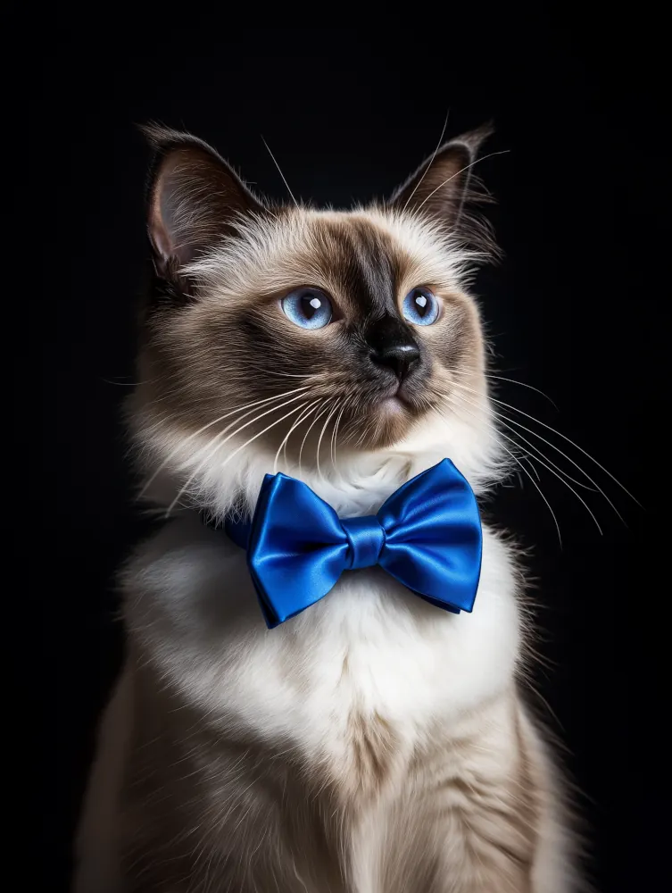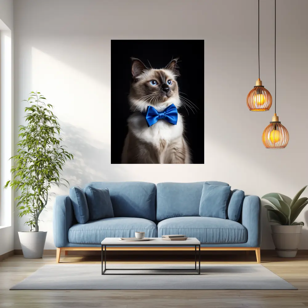 Cette œuvre captivante intitulée “Le Sacré de Birmanie en Gala” met en scène un chat sacré de Birmanie au regard perçant, dont les yeux bleus hypnotiques semblent scruter l’âme de l’observateur.