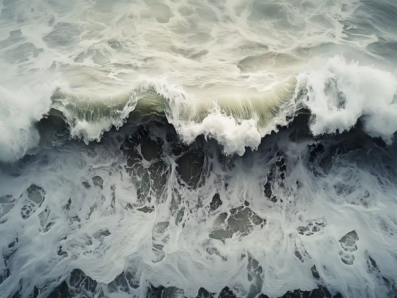 Vue d’en haut, la vague se déploie en contrebas, donnant l’impression de voler au-dessus de l’eau. L’écume blanche trace des motifs presque graphiques à la surface, tandis que les courants dessinent des lignes mouvantes qui captivent le regard. Cette perspective inhabituelle nous fait redécouvrir la mer autrement, comme si elle révélait ses secrets à travers le mouvement de l’eau.